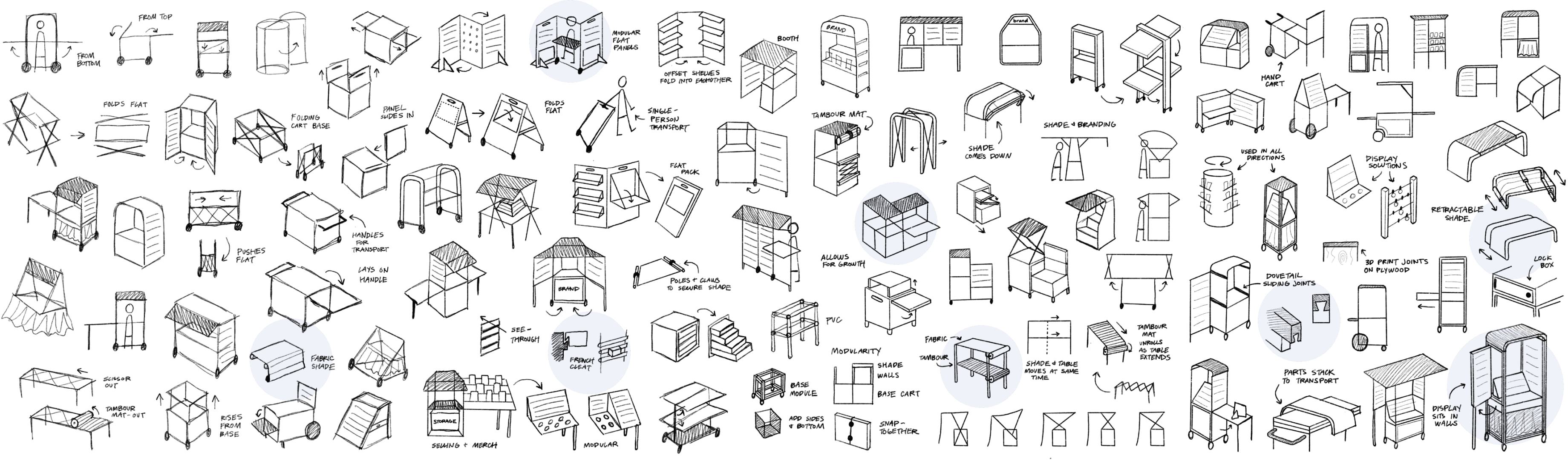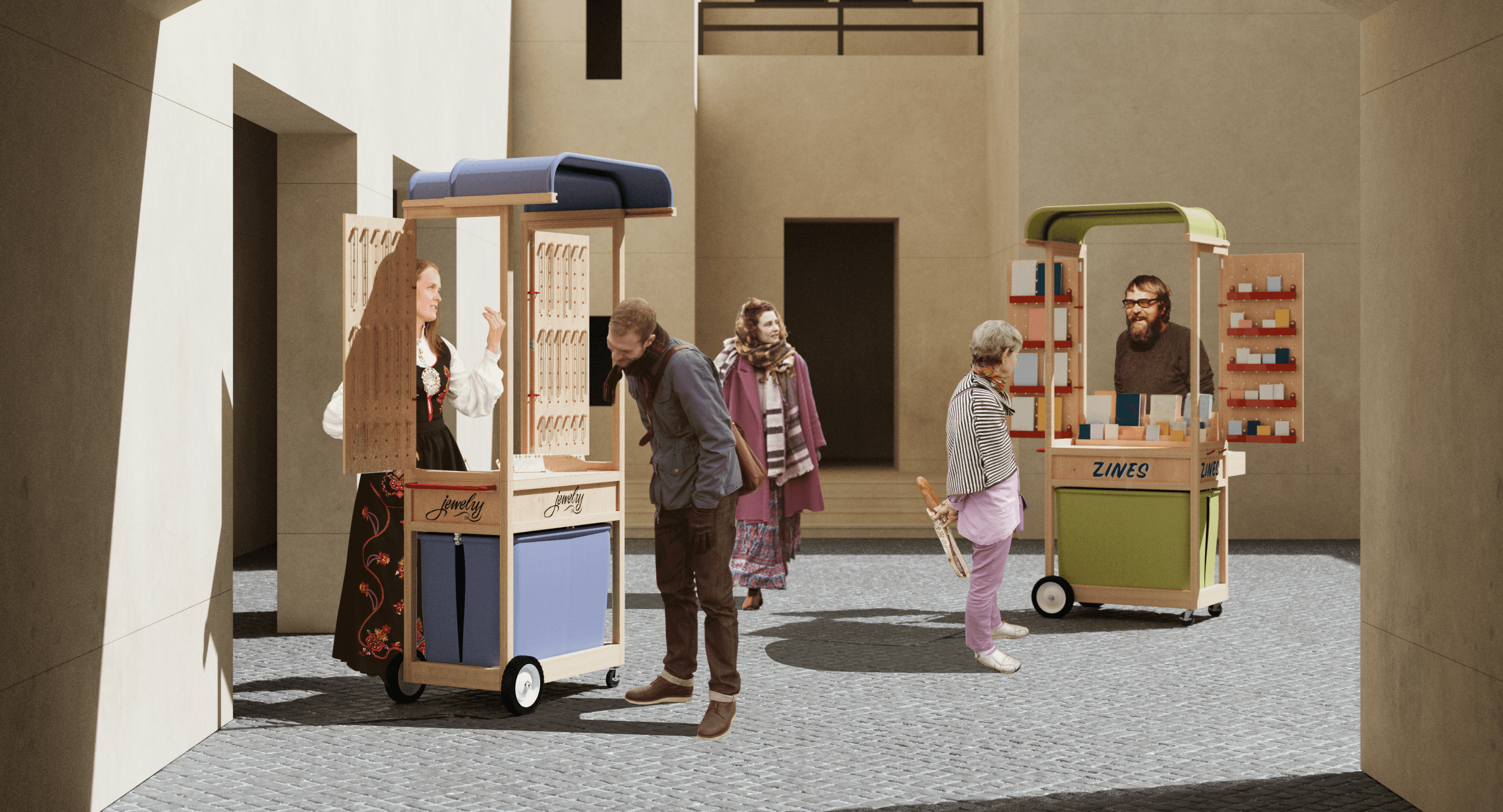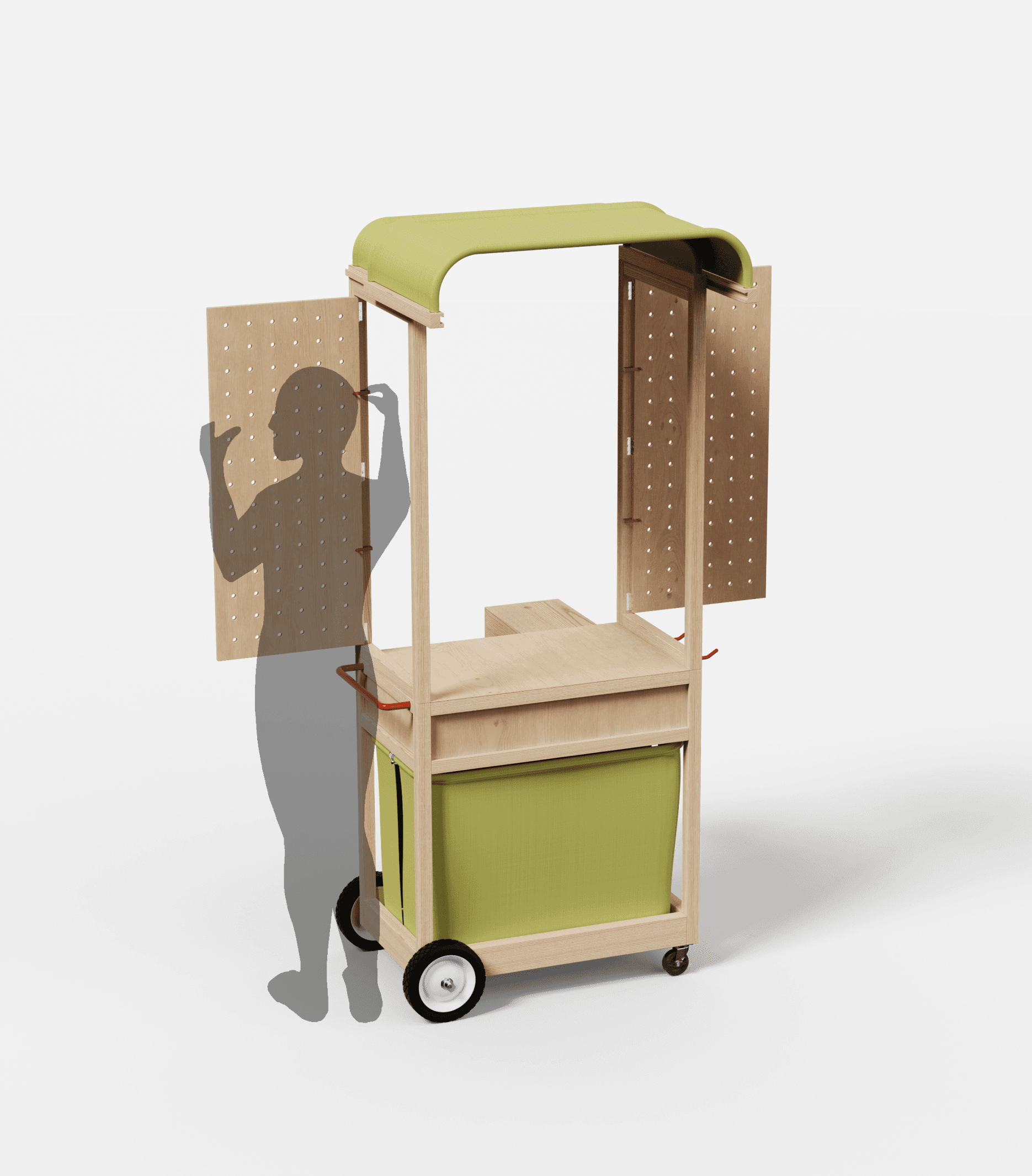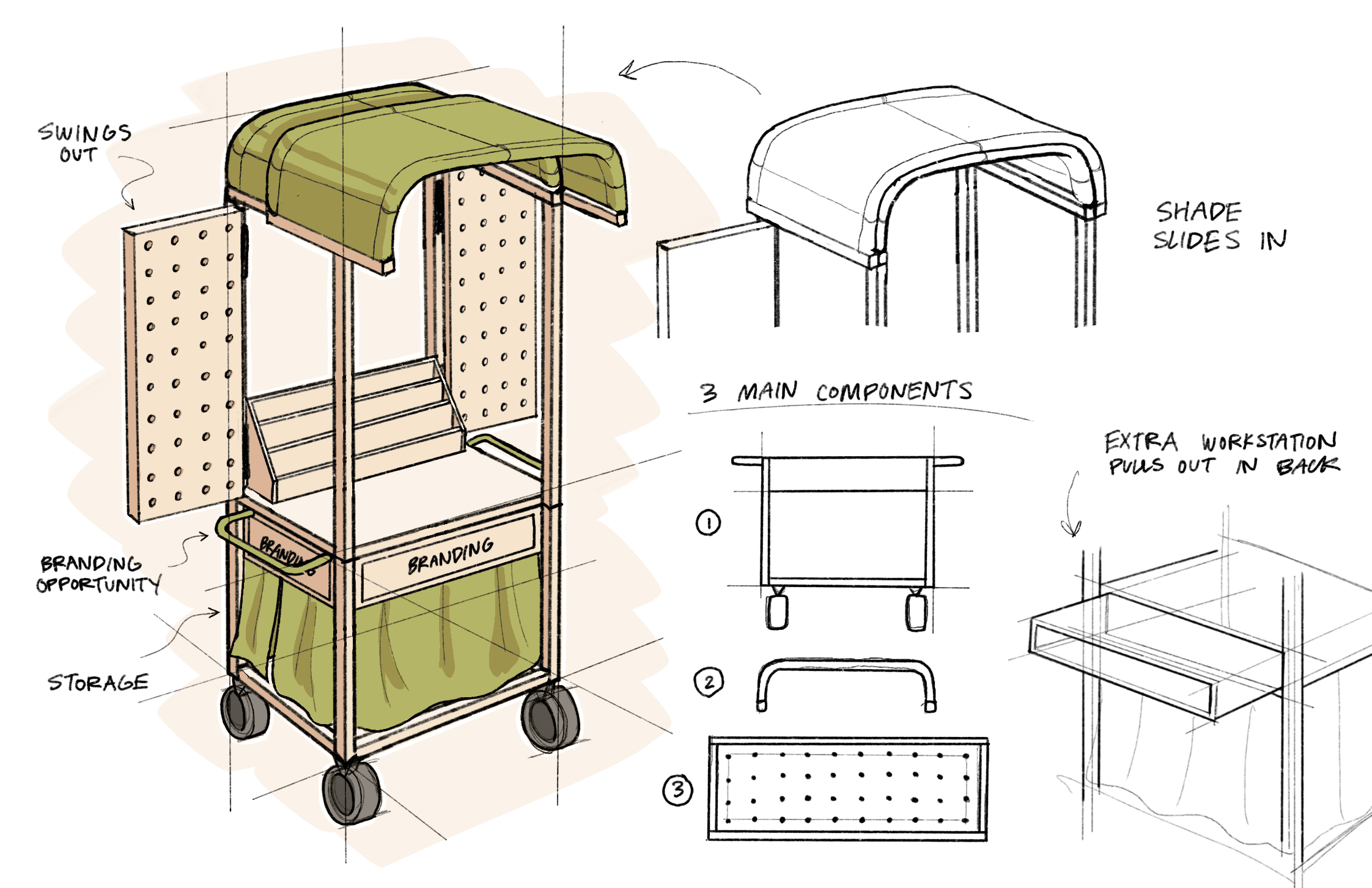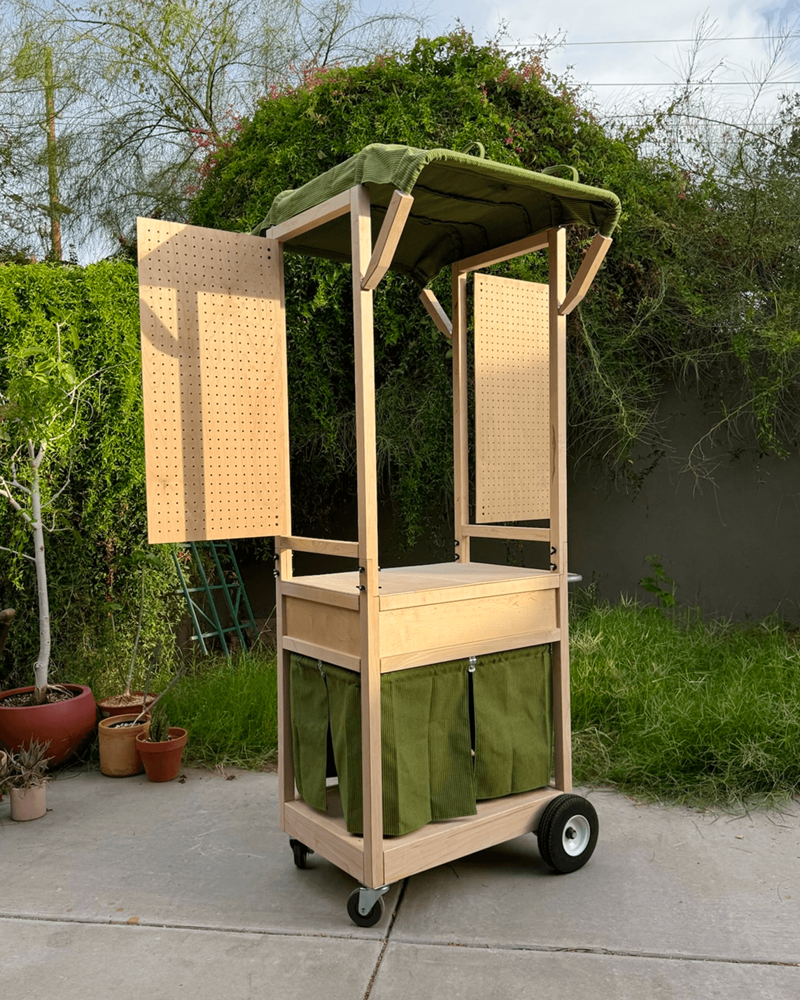 Flexible selling cart for artisans and small business owners. It can be transported compactly and transforms for selling. It consists of the base cart, walls, and shade.