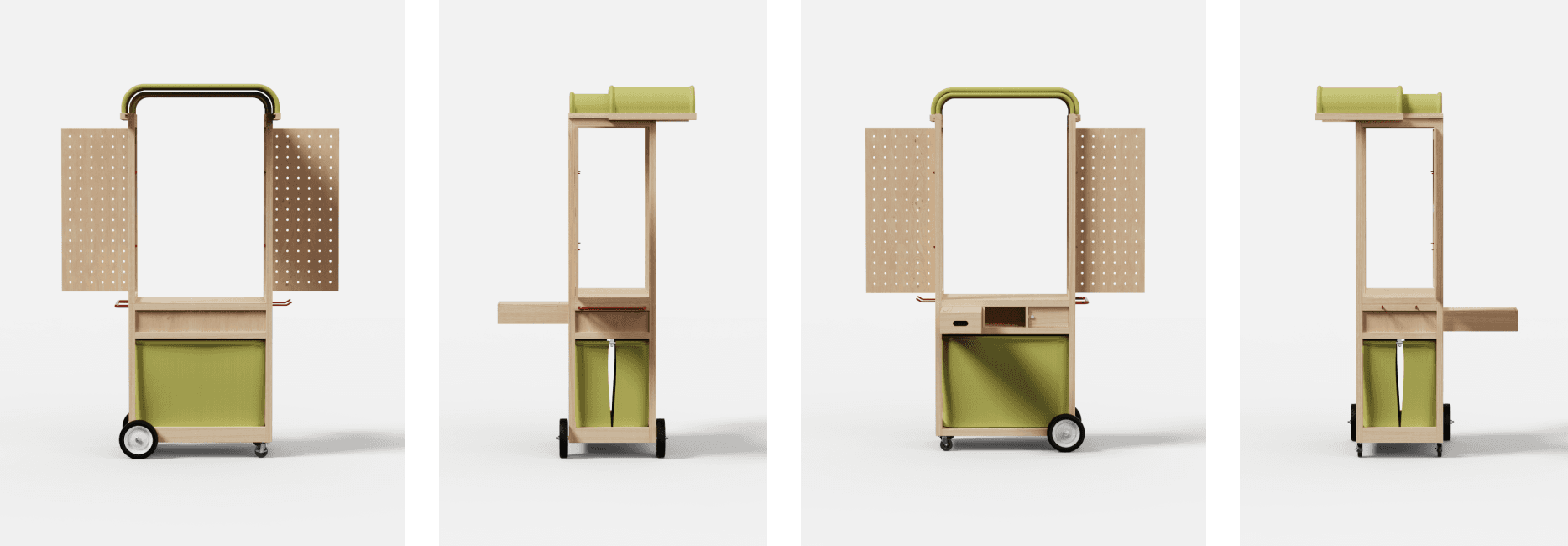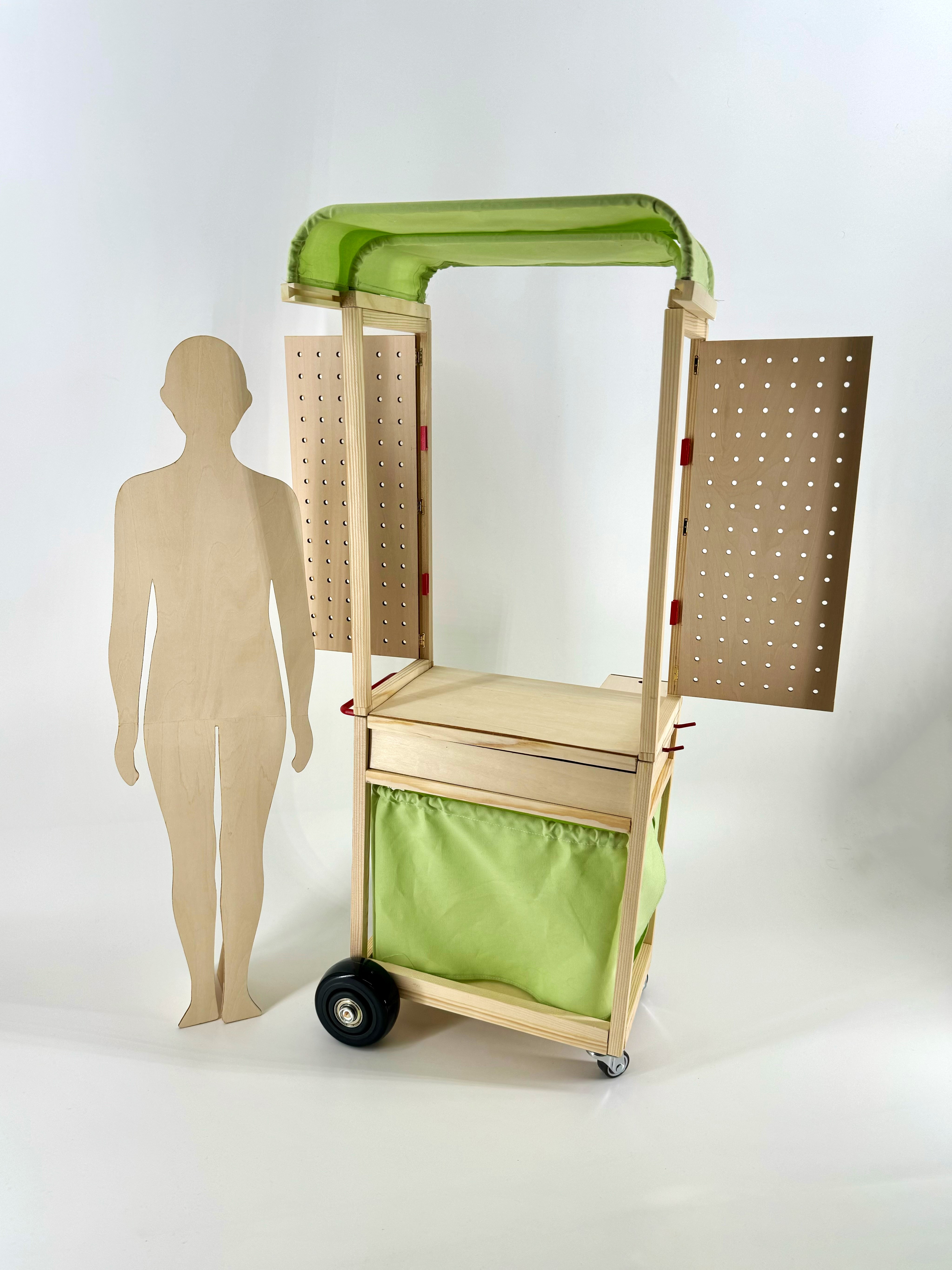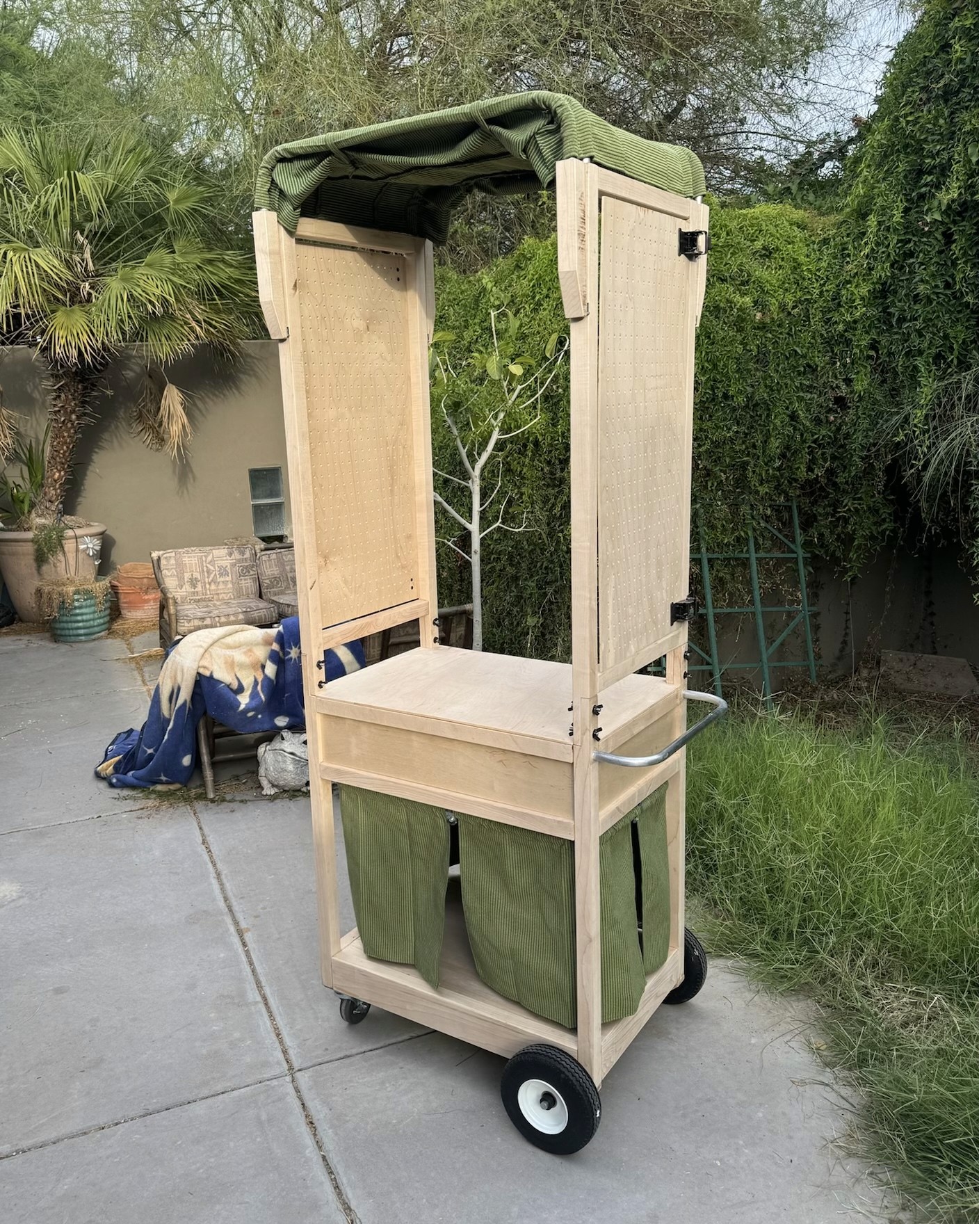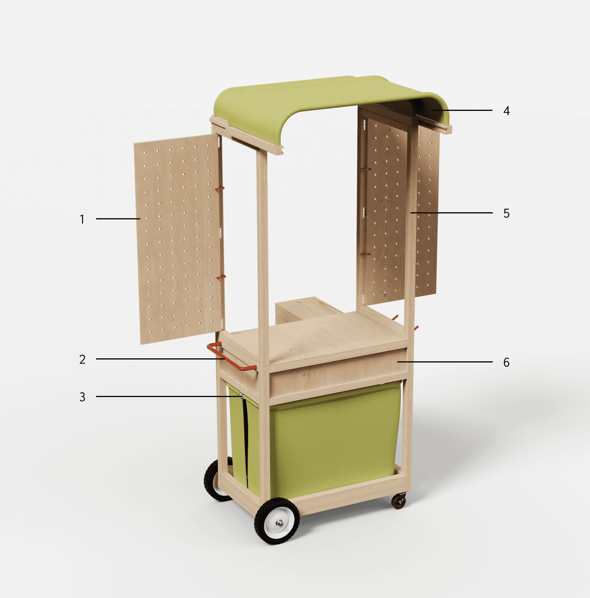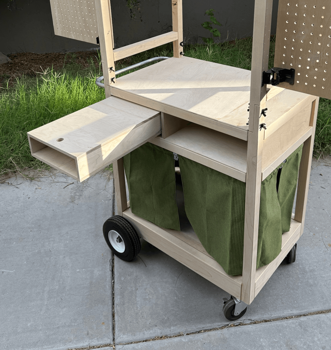 Flexible selling cart for artisans and small business owners. It can be transported compactly and transforms for selling. It consists of the base cart, walls, and shade.