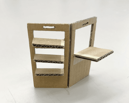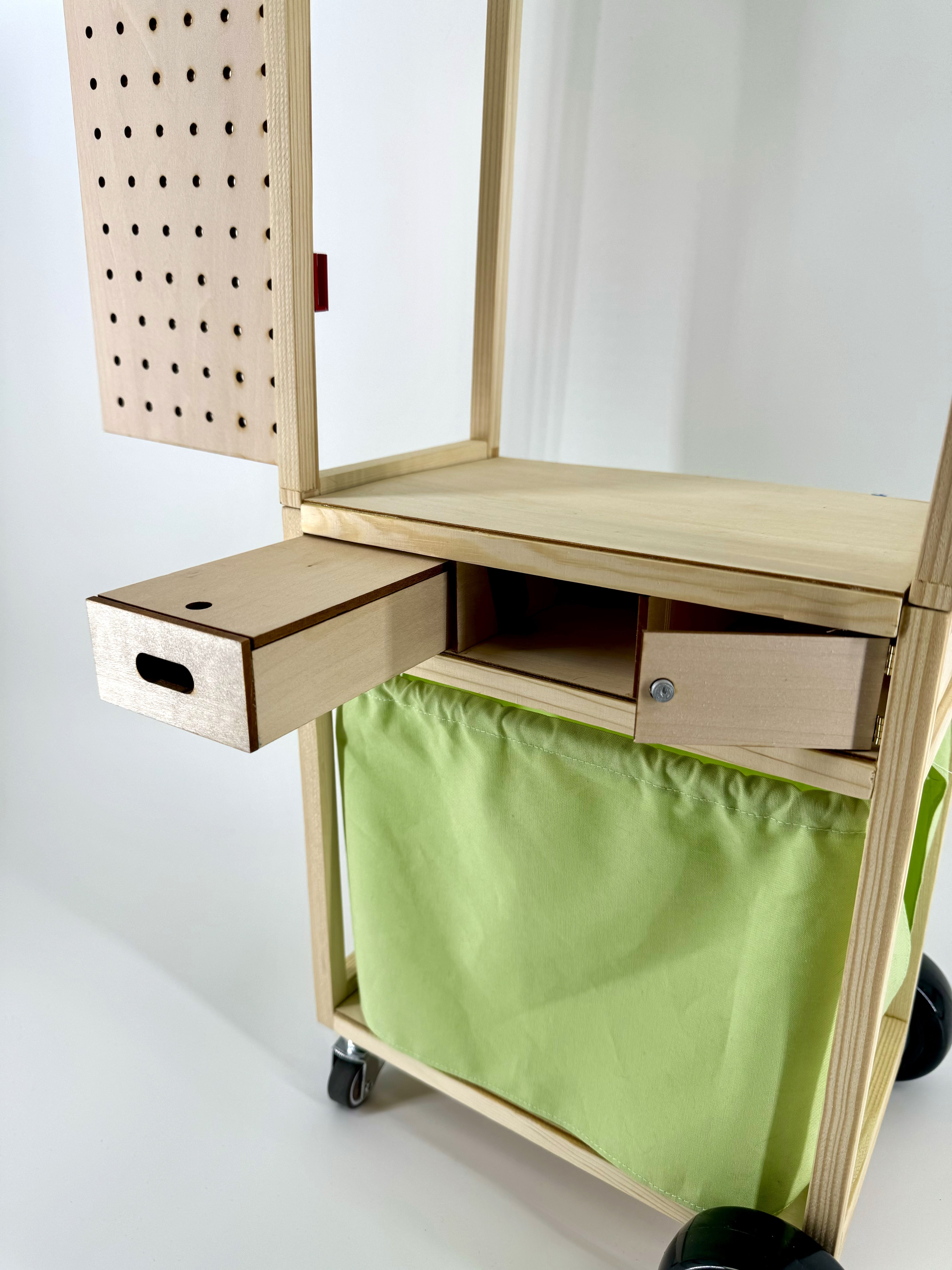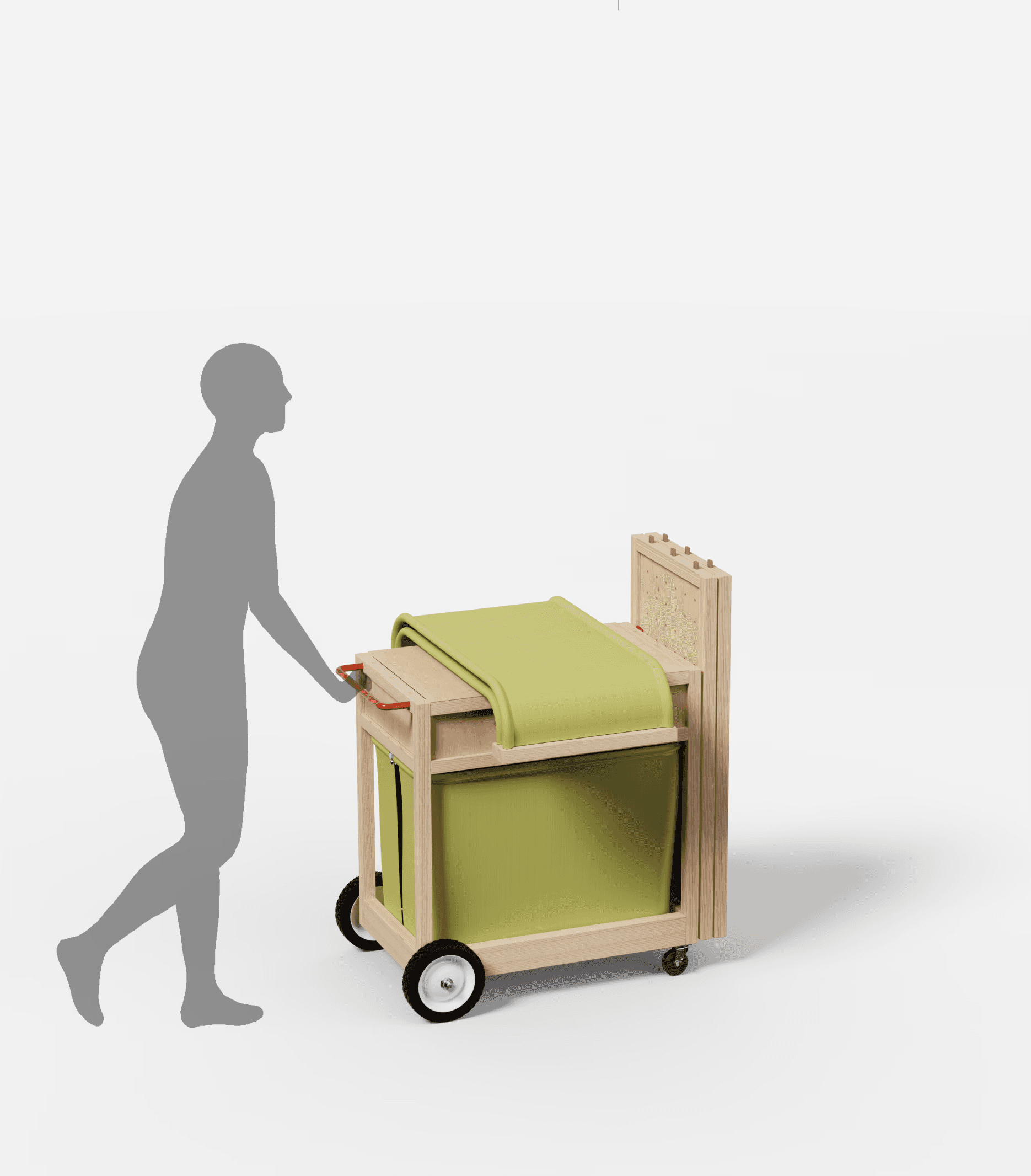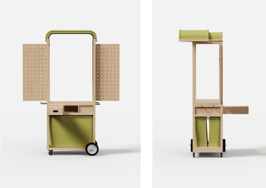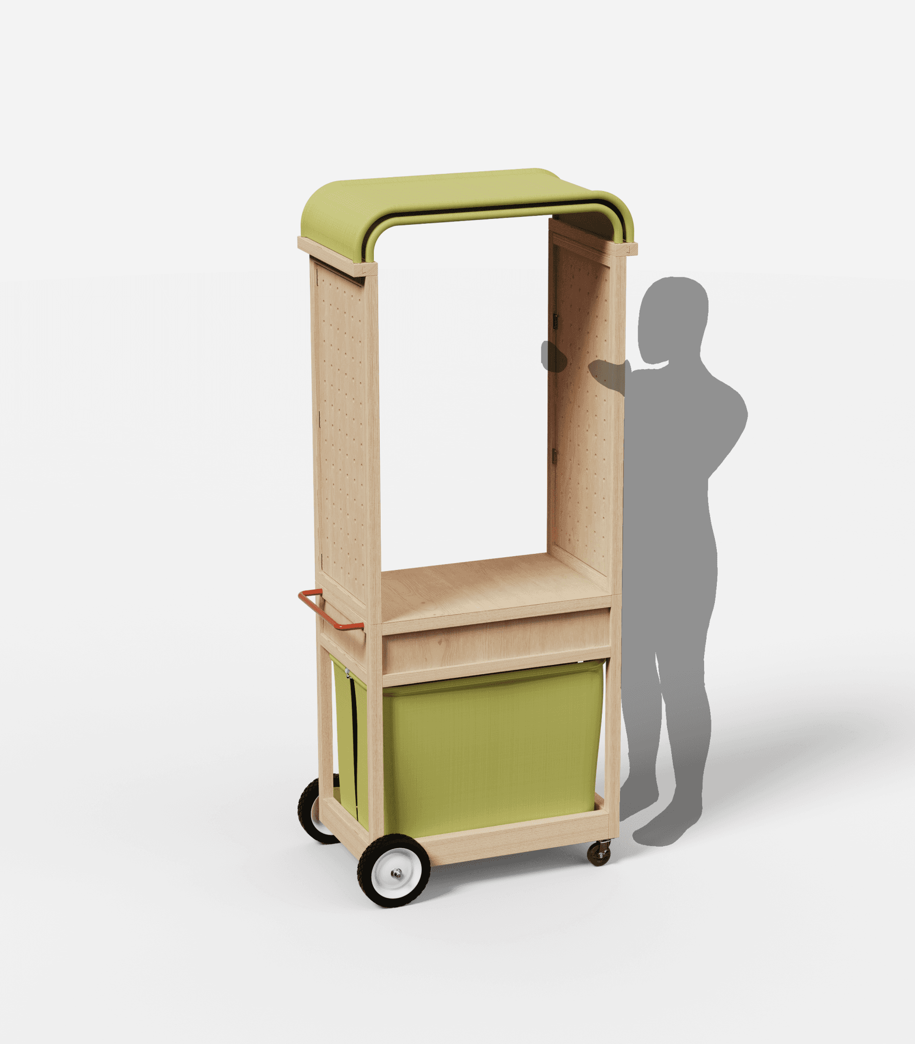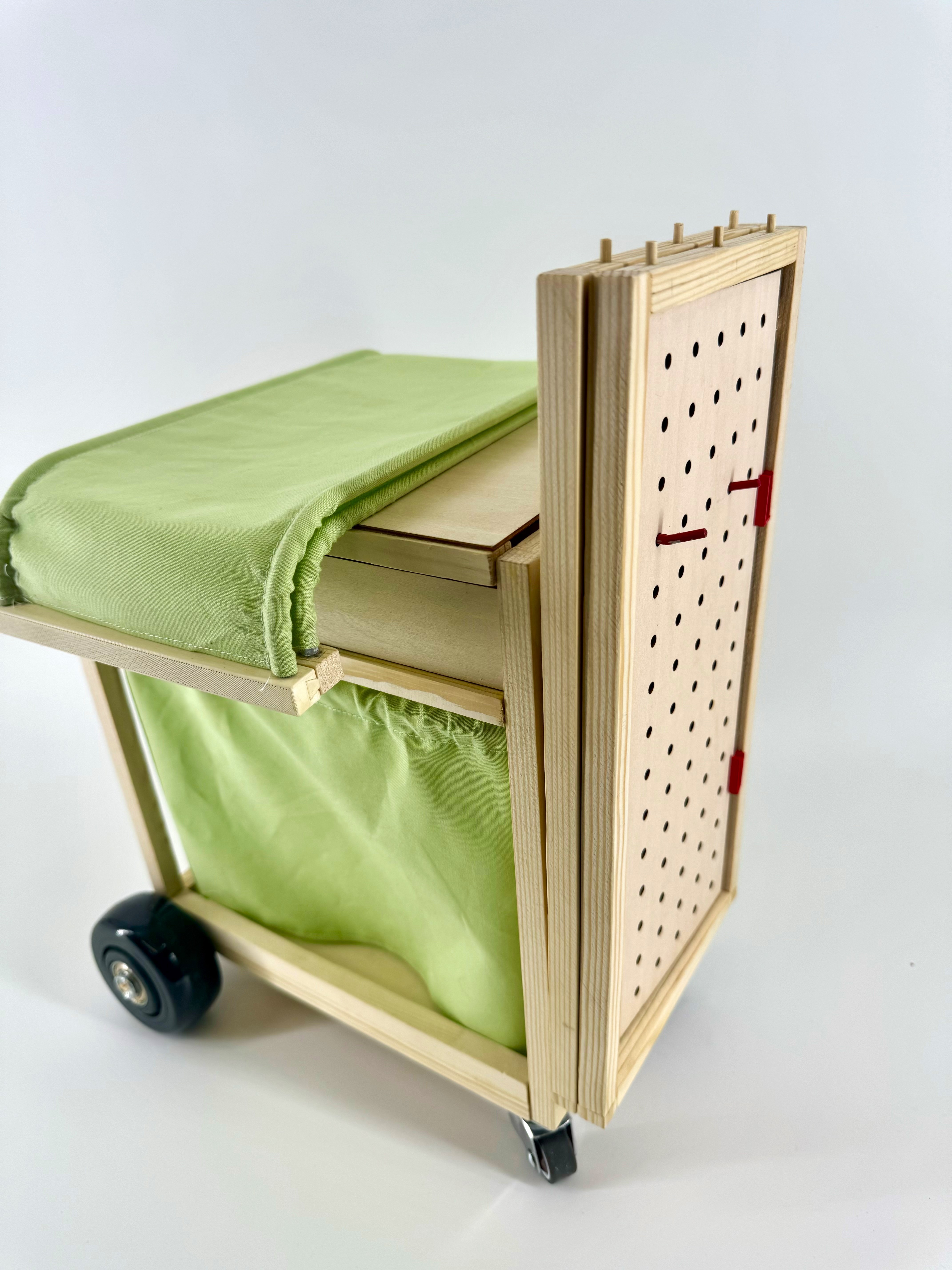 Flexible selling cart for artisans and small business owners. It can be transported compactly and transforms for selling. It consists of the base cart, walls, and shade.
